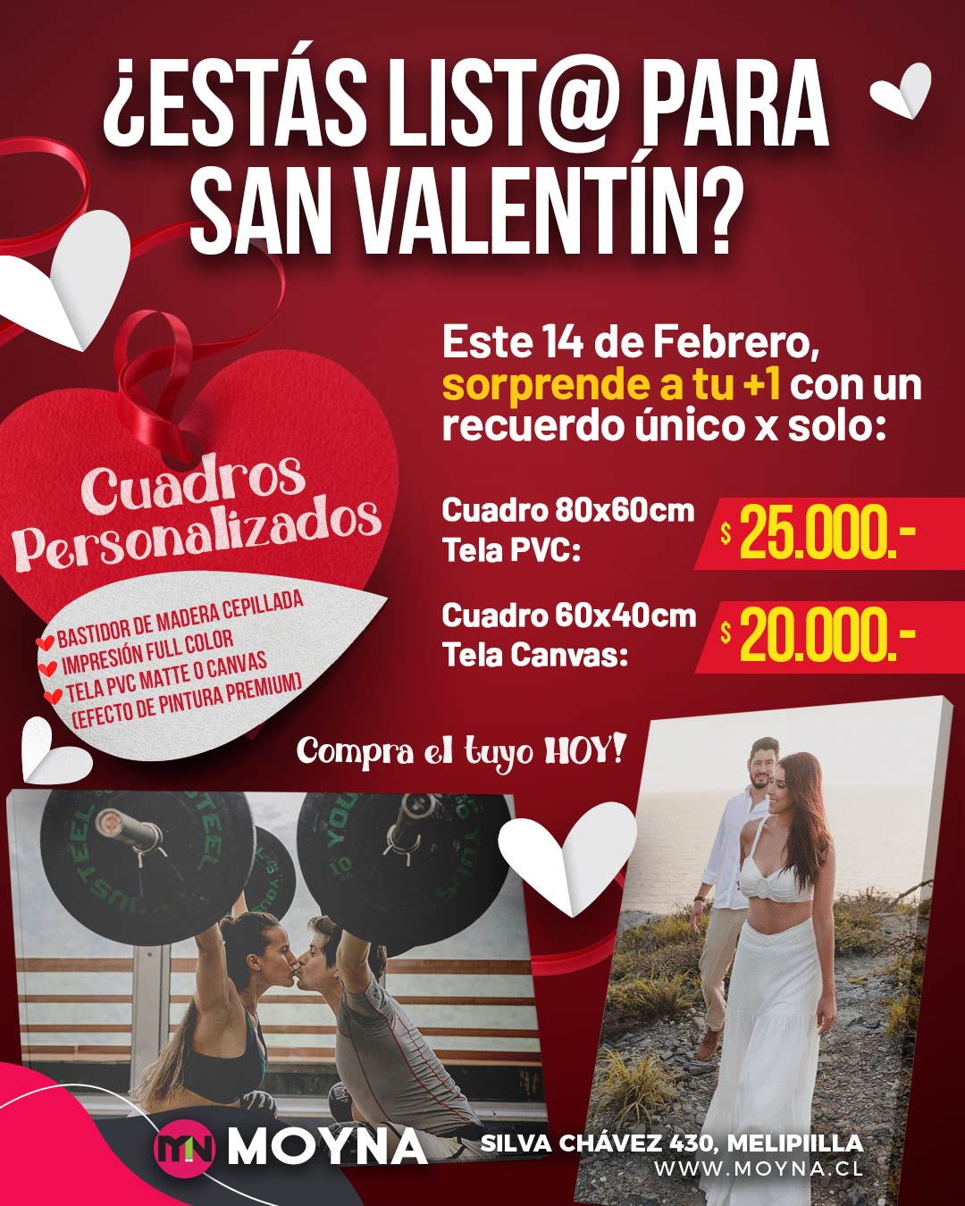 Sorprende este San Valentín con un cuadro personalizado impreso en tela PVC o tela Canvas, montado en bastidor de madera de alta resistencia. Convierte tus mejores recuerdos, fotos o mensajes especiales en una pieza decorativa única, con colores vibrantes, excelente calidad de impresión y un acabado profesional.